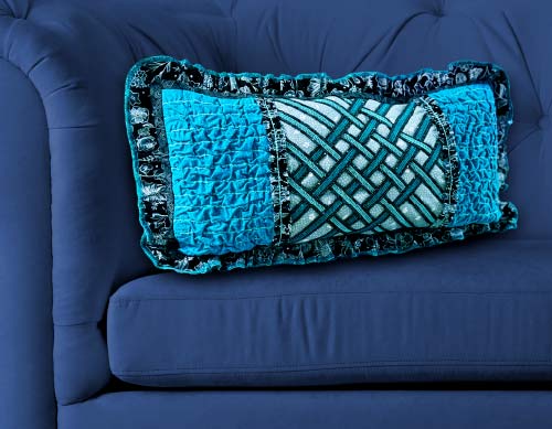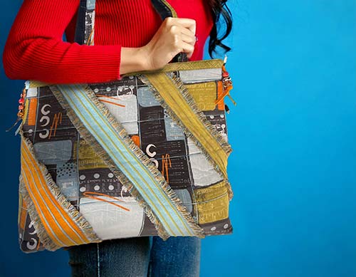 - Embellish fabric with a chain/cover stitch and cut into squares